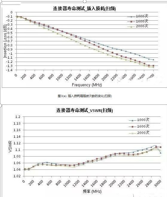 2.正常使用前提下,射頻連接器的壽命將會大大超過500次的標準值;在整個頻段內(nèi),沒有發(fā)現(xiàn)某個頻點有插入損耗和駐波的跳變現(xiàn)象。