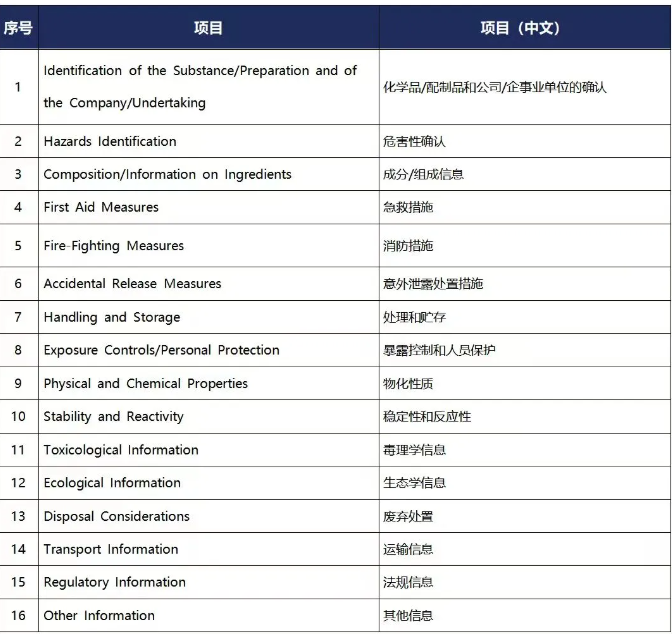 MSDS有規(guī)定格式和標(biāo)準(zhǔn)依據(jù),不同國家有不同的MSDS標(biāo)準(zhǔn),常規(guī)MSDS一般包括16項(xiàng):
